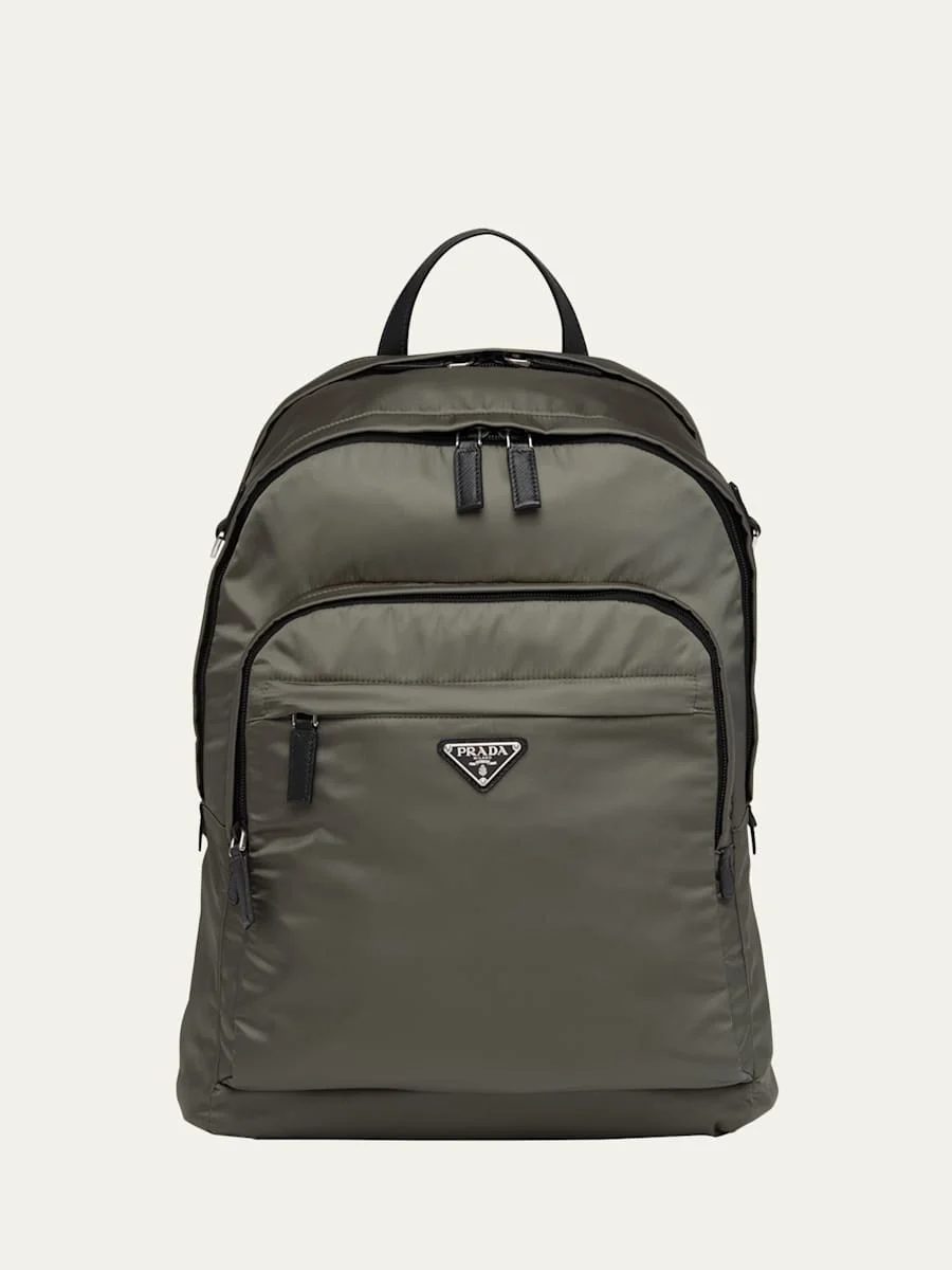 Prada nylon backpack features the signature enameled triangle logo Approx. 12.2"W x 7.8"D x 17.12"H Double zip closure Top carry handle Two main compartments Two front zip pockets Internal zip pocket; slip pocket Mesh back panel Adjustable shoulder straps Made in Italy Online Inquiries: BGS21_NAWQR| Store Inquiries: #4215556