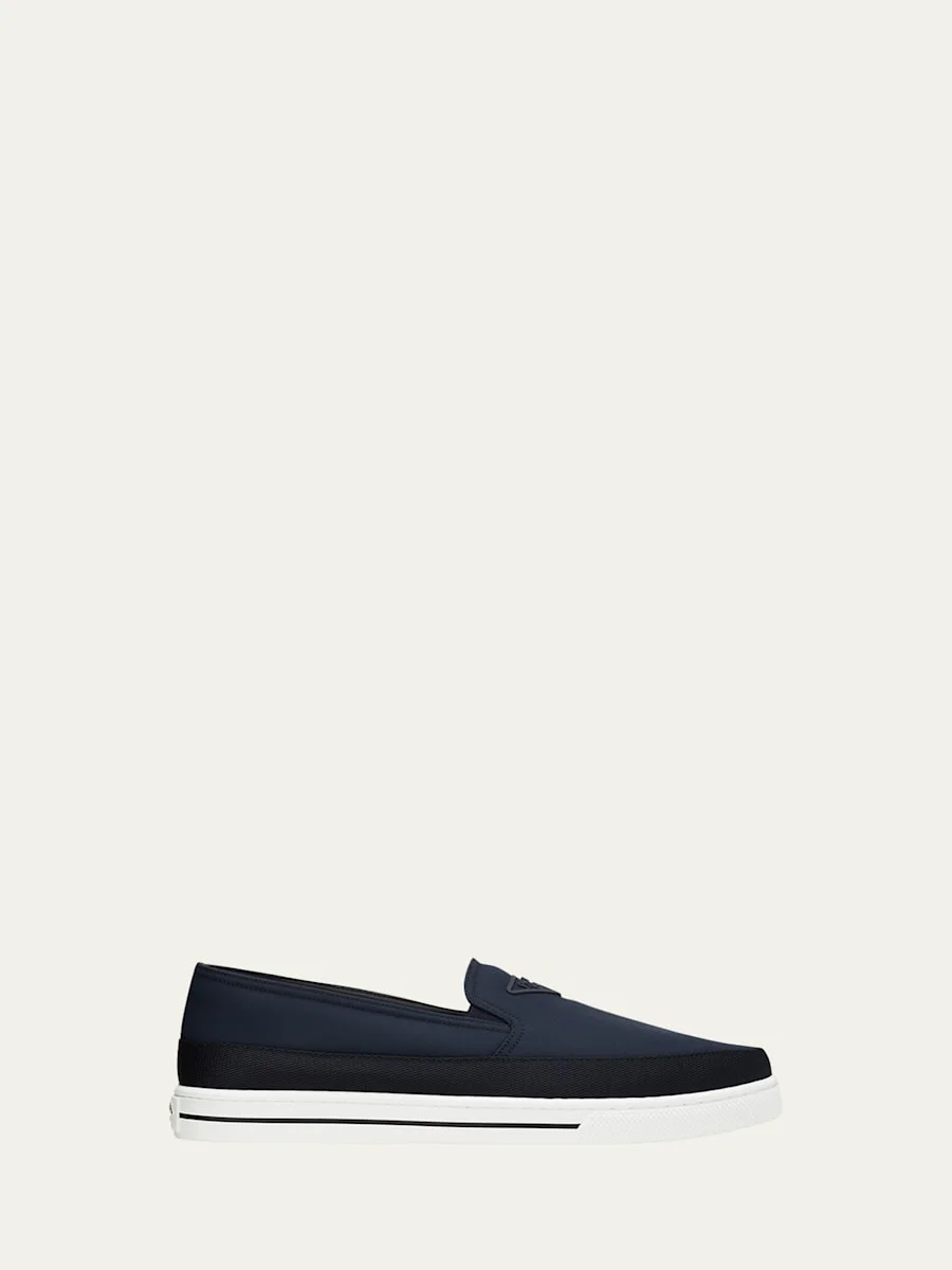 Prada slipon loafers in nylon feature a modern, minimalist design with a tonal embossed rubber triangle logo at the vamp Flat heel Round toe Notched vamp Removable leathercovered insole Logo accent at heel Lightweight foam soles Slipon style Made in Italy