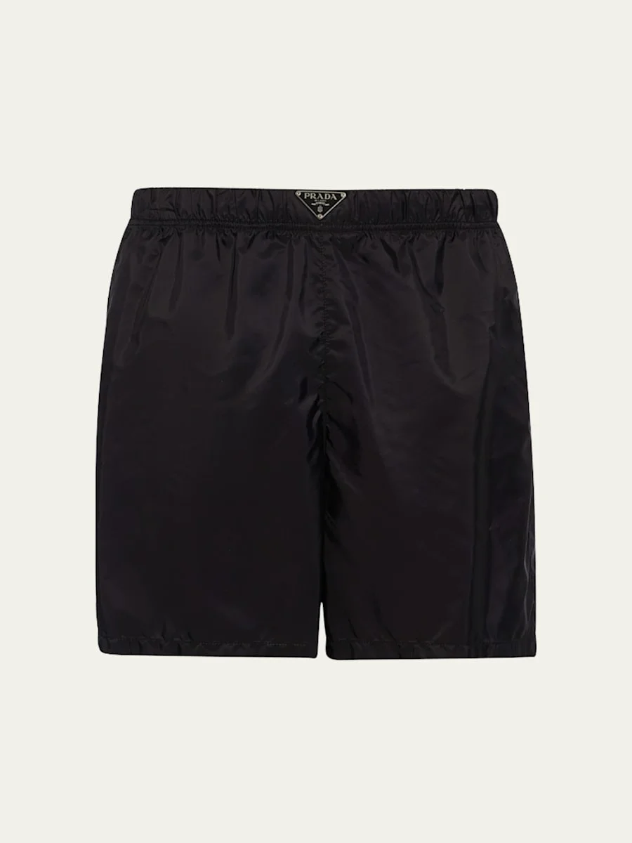 Prada swim trunks finished with a sheen Signature triangle logo Elastic waistband Side pockets; single back pocket Classic fit Nylon/polyamide Made in Italy Online Inquiries: BGS21_ND2QR| Store Inquiries: #5006946