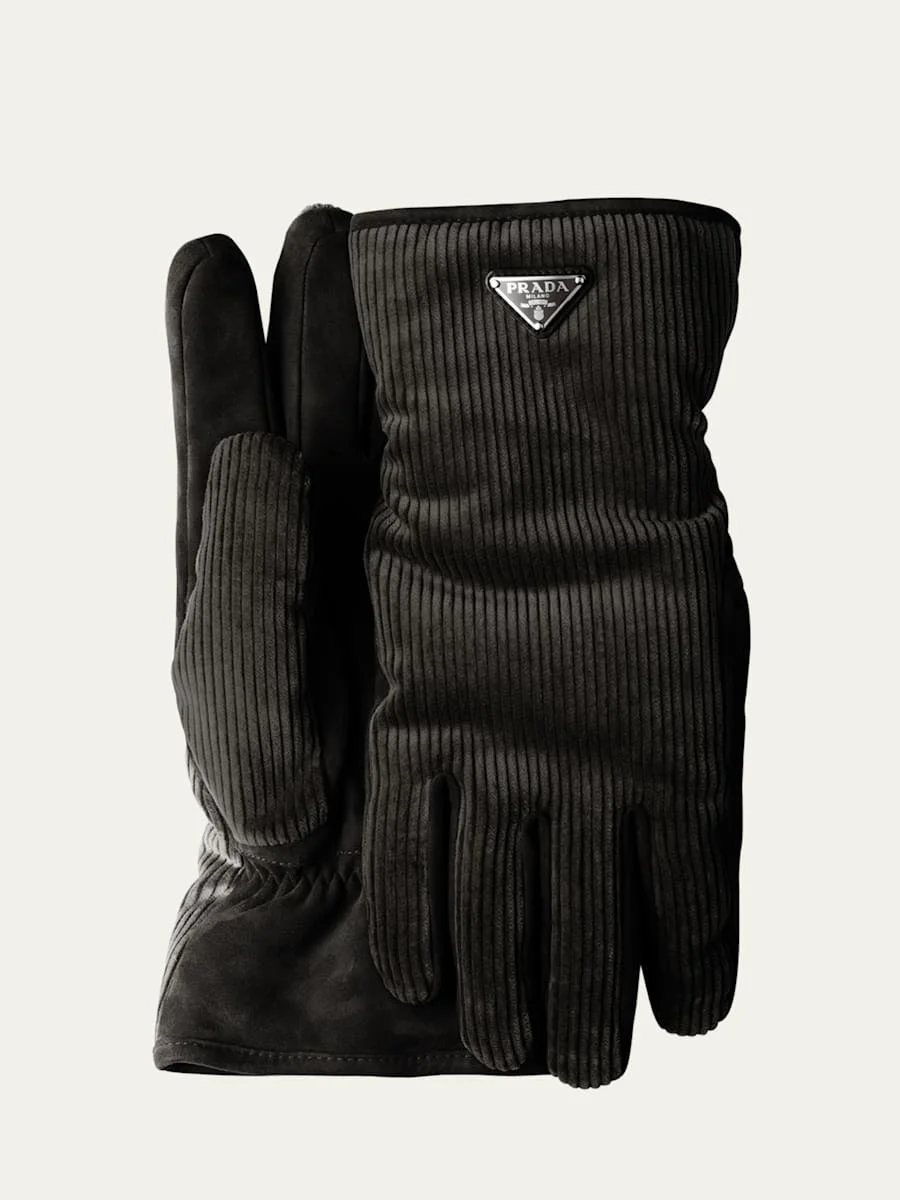 Prada "Velluto Coste" gloves in cotton corduroy and suede Signature enameled leather logo patch Elasticized wrists Cotton/suede Lining: Cotton Made in Italy