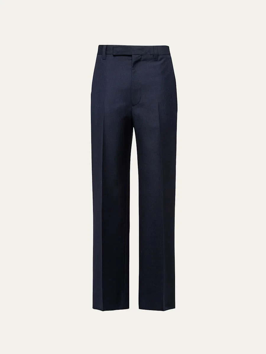 Men's solid pants by Prada Constructed waistband with hidden hook and zipper fly Angled front slash pockets Back welt pocket with button Full length Wide legs Wool/mohair/cotton Made in Italy Model is 6'1"/185cm. Online Inquiries: BGS21_N99CC| Store Inquiries: #4312674