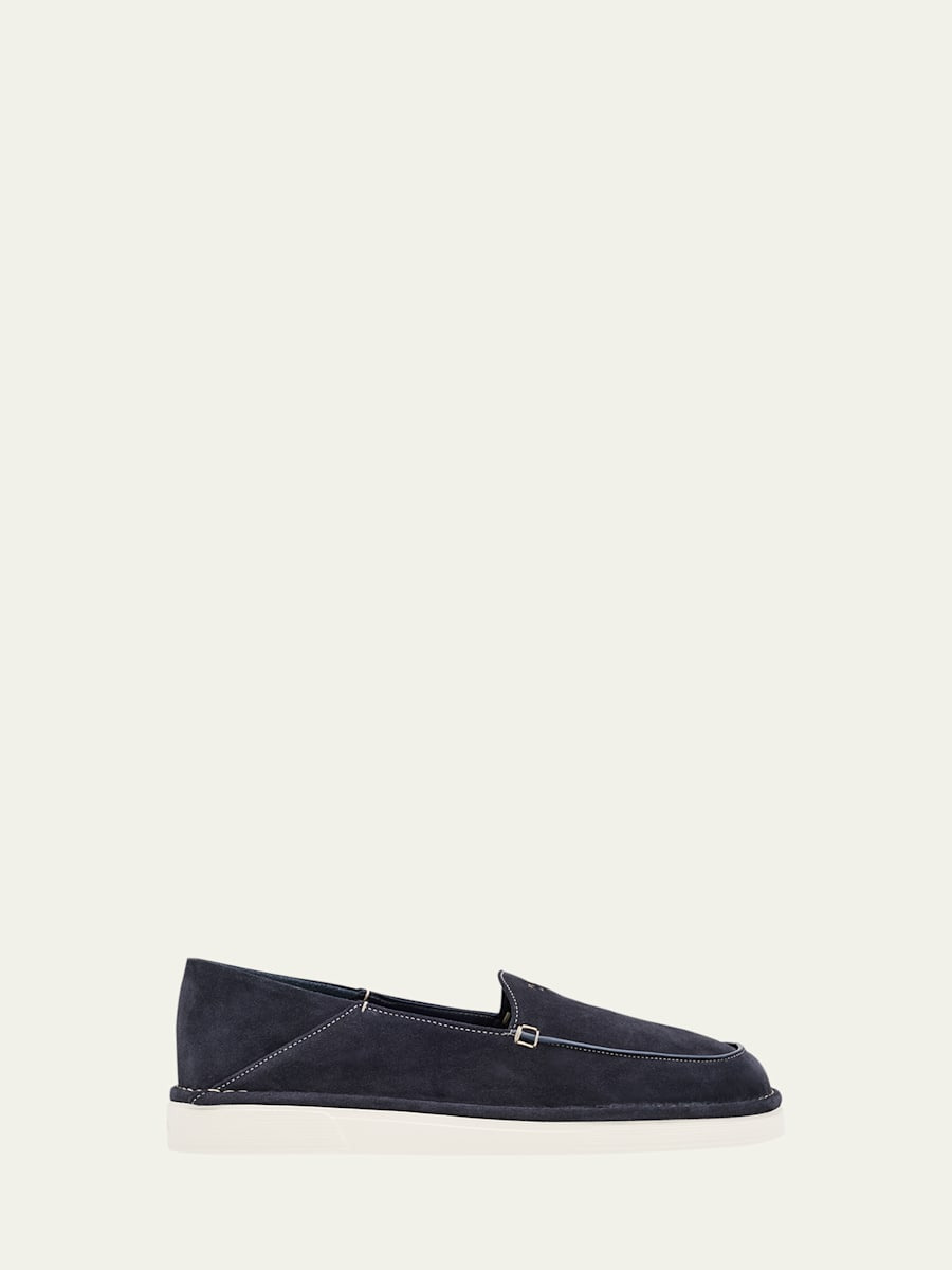Prada loafers in supple suede, defined by foiled logo lettering on the center vamp Contrast topstitching Flat heel Round moc toe Heel logo Rubber outsole Slip-on style Professional cleaning recommended Made in Italy Online Inquiries: BGS21_ND3HJ| Store Inquiries: #5016993