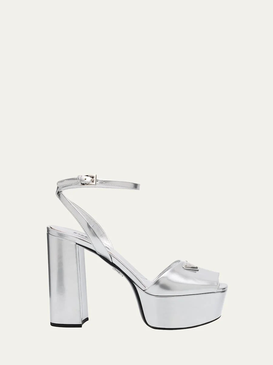 Prada metallic leather platform sandals Signature logo triangle accent 4.50 in / 115 mm block heel Peep toe Adjustable ankle strap Rubber outsole Lining: Unlined Professional cleaning recommended Made in Italy Online Inquiries: BGS21_X6QZU| Store Inquiries: #4895229