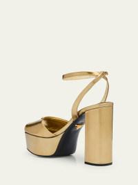 Prada metallic leather platform sandals Signature logo triangle accent 4.50 in / 115 mm block heel Peep toe Adjustable ankle strap Rubber outsole Lining: Unlined Professional cleaning recommended Made in Italy Online Inquiries: BGS21_X6QZU| Store Inquiries: #4895229