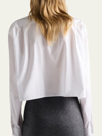 Prada cotton popeline shirt featuring double neck tie details Point collar; button front Long sleeves; button cuffs Chest patch pockets Yoked back; double pleats Boxy fit Cropped length Cotton Dry clean Imported Online Inquiries: BGS21_BA9PR| Store Inquiries: #5063756