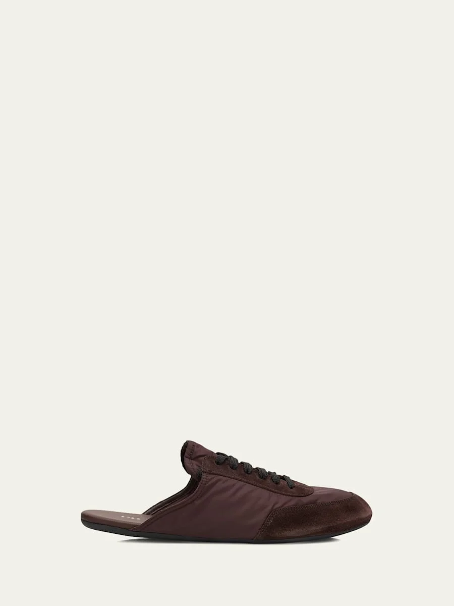 Prada sneaker mules in nylon and suede 0.17 in / 5 mm flat heel Round toe Lace-up vamp with logo Unlined Rubber outsole Easy slide style Made in Italy Online Inquiries: BGS21_X6UFV| Store Inquiries: #4973362