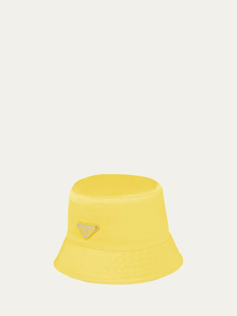 Prada bucket hat in nylon Signature triangle logo accent Flat top Downturned brim Nylon/polyamide/leather Made in Italy
