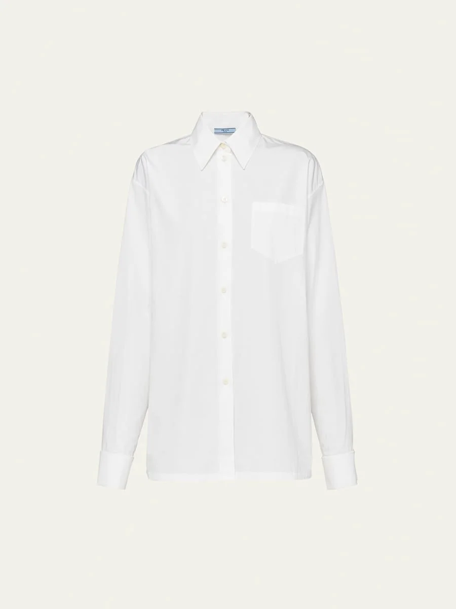 Prada poplin blouse features cuffs with rhinestone pave cufflinks Spread collar; button front Long sleeves Chest patch pockets Slim fit Cotton Made in Italy