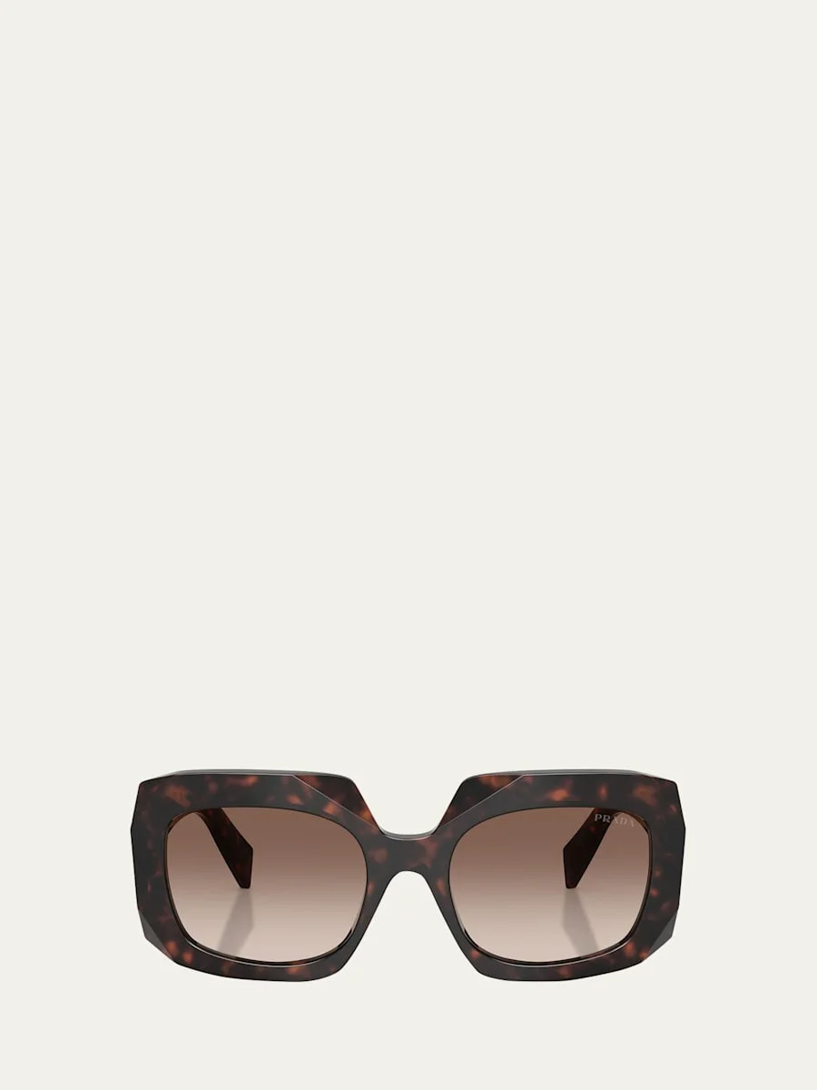 Prada "PR B23SF" square sunglasses feature a root tortoise color on a square frame with brown gradient lenses. Designed to address common issues such as eyewear sliding down the nose or pressing on the temples and cheeks, this feature provides enhanced stability and comfort. Lowbridge fit ensures a secure, comfortable wear for lowbridge noses and higher cheekbones, preventing slippage and pressure on the temples and cheeks. Eye/bridge/temple (in mm): 5519145mm Gradient lenses Saddle nose bridge Triangle logo on temples Wide, tapered arms 100% UVA/UVB protection Acetate Spot clean Made in Italy