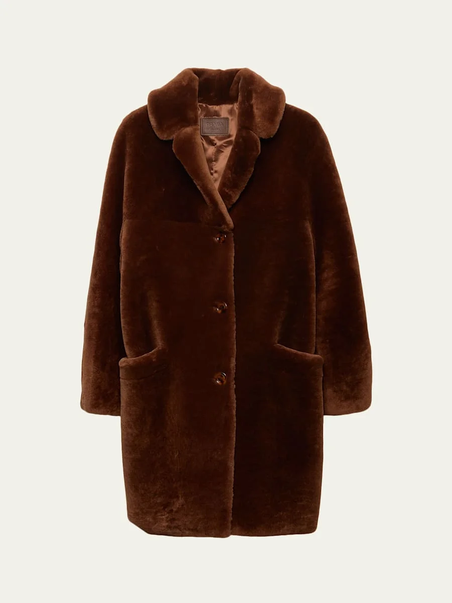 Prada natural and dyed shearling (Italy) Montone coat Notch lapels; button front Long sleeves Front pockets Straight fit Satin lining Dry clean Made in Italy