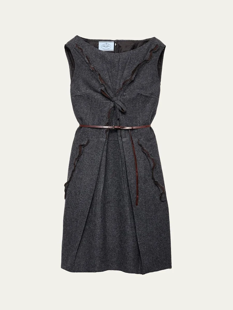 Tailored in wool, this Prada dress boasts rawcut edges adorned with a bow front and adjustable calf leather belt. Boat neckline Sleeveless Inseam pockets Oversized fit Hem hits around the knee Center back zip Wool Professional cleaning recommended Made in Italy