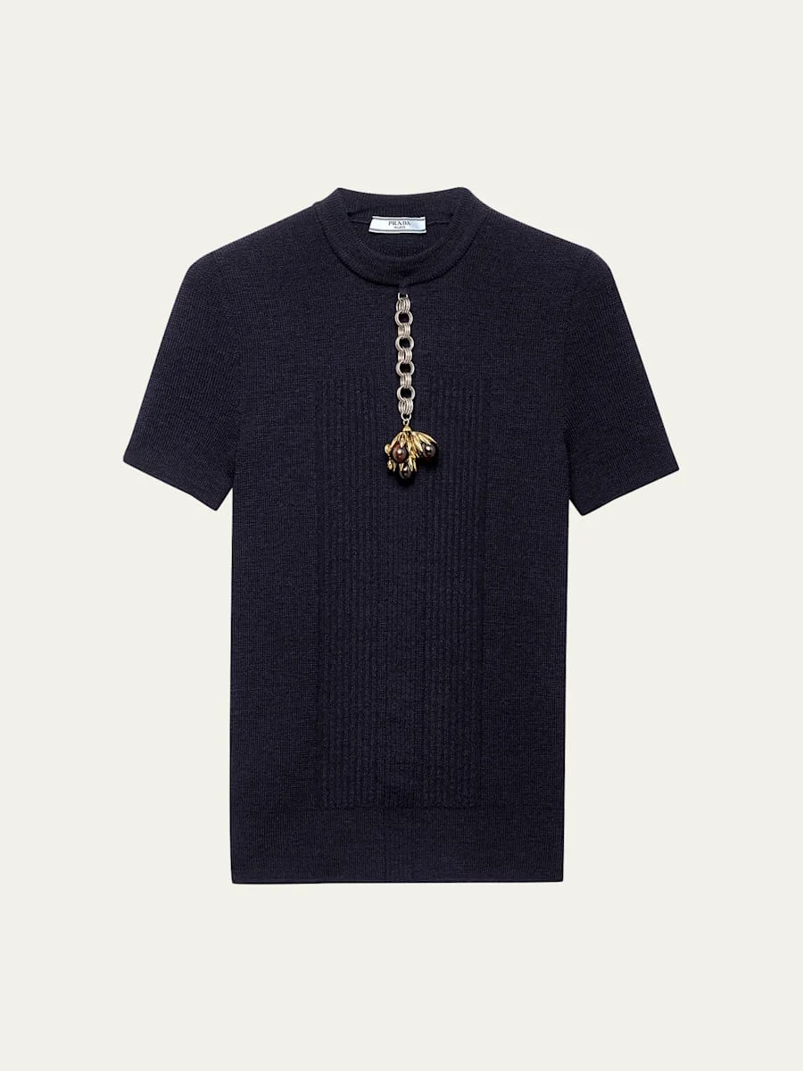 Prada knitted wool sweater adorned with a metal and stone pendant Crew neckline Short sleeves Classic fit Hem sits at the hip Pullover style Wool Professional cleaning recommended Made in Italy