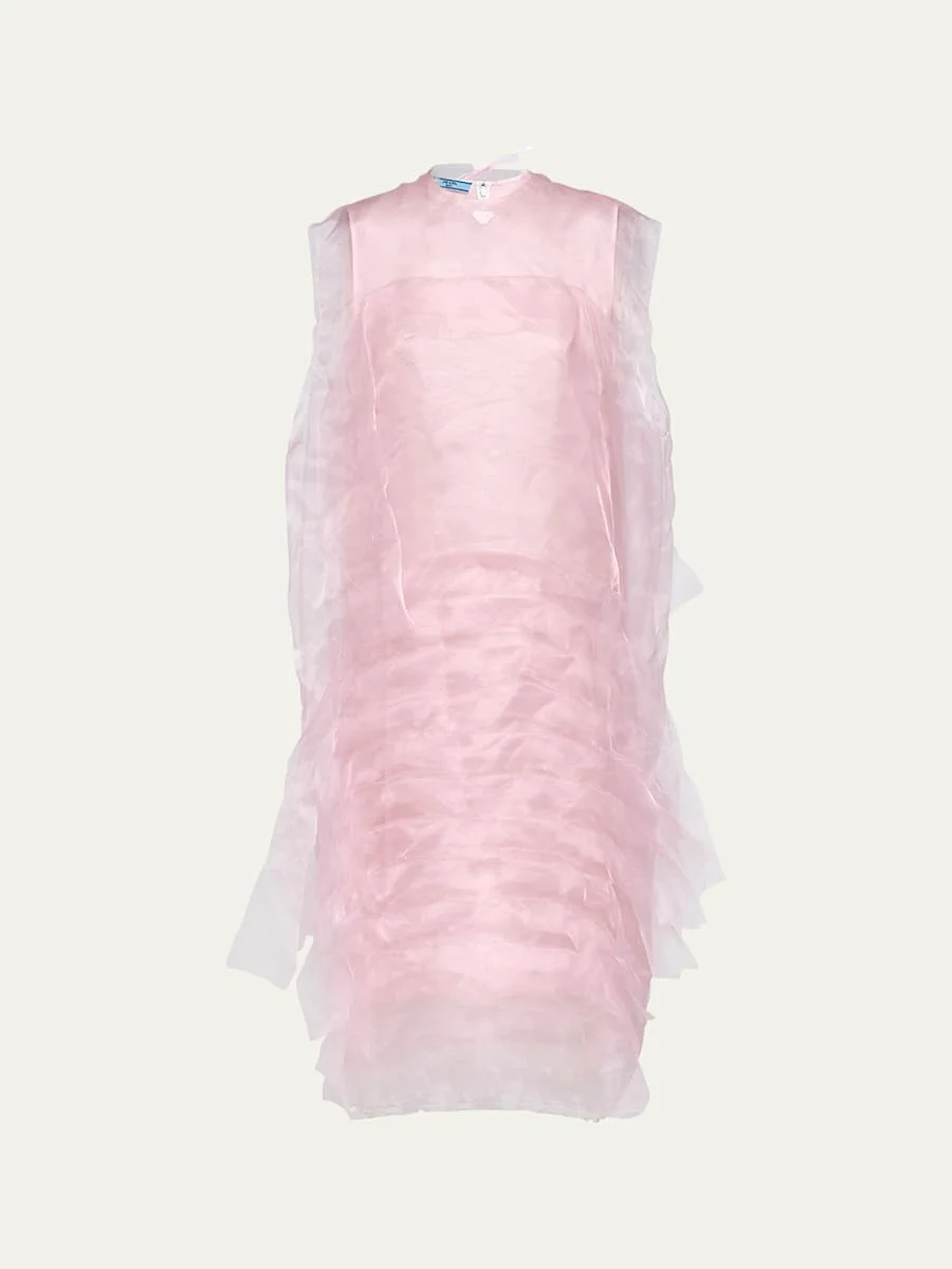 Prada technical voile overlay dress featuring an enameled metal triangle logo Round neckline Sleeveless Straight fit Fluid silhouette Hem hits around the knee Invisible back zip Silk/polyester Dry clean Made in Italy
