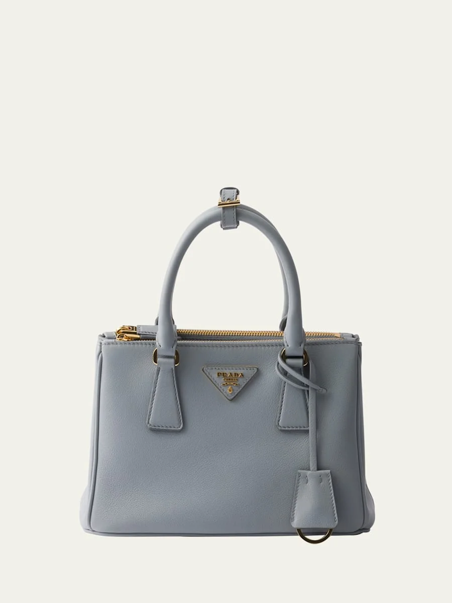Prada "Galleria" top handle bag in leather Rolled top handles with snap strap; keyring tag Open top with two side snap closures Exterior, two zip compartments, one zip pocket Approx. 6.5"H x 9.6"W x 4.3"D Made in Italy
