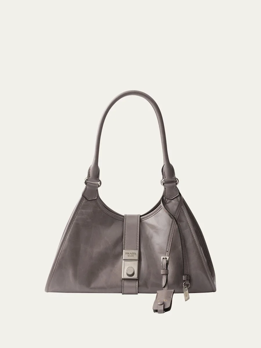 Prada trapezoidal silhouette shoulder bag in soft lux calf leather Shoulder strap with keyring tag Open top with center pushlock closure Interior, one zip pocket Approx. 8.3"H x 12.6"W x 5.9"D Made in Italy
