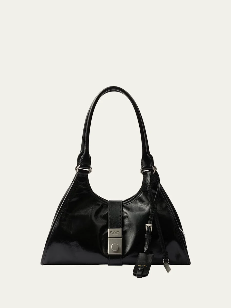 Prada trapezoidal silhouette shoulder bag in soft lux calf leather Shoulder strap with keyring tag Open top with center pushlock closure Interior, one zip pocket Approx. 8.3"H x 12.6"W x 5.9"D Made in Italy