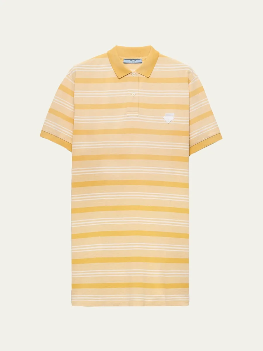 Prada presents a relaxed take on casual styling with this polo dress, showcasing a striped motif and the house's signature fabric triangle logo. Spread collar Twobutton placket Short sleeves Mini length Shift silhouette Pullover style Cotton Dry clean Made in Italy SIZE amp; FITModel measurements: 5'10" tall Model is wearing a US size 4/Small