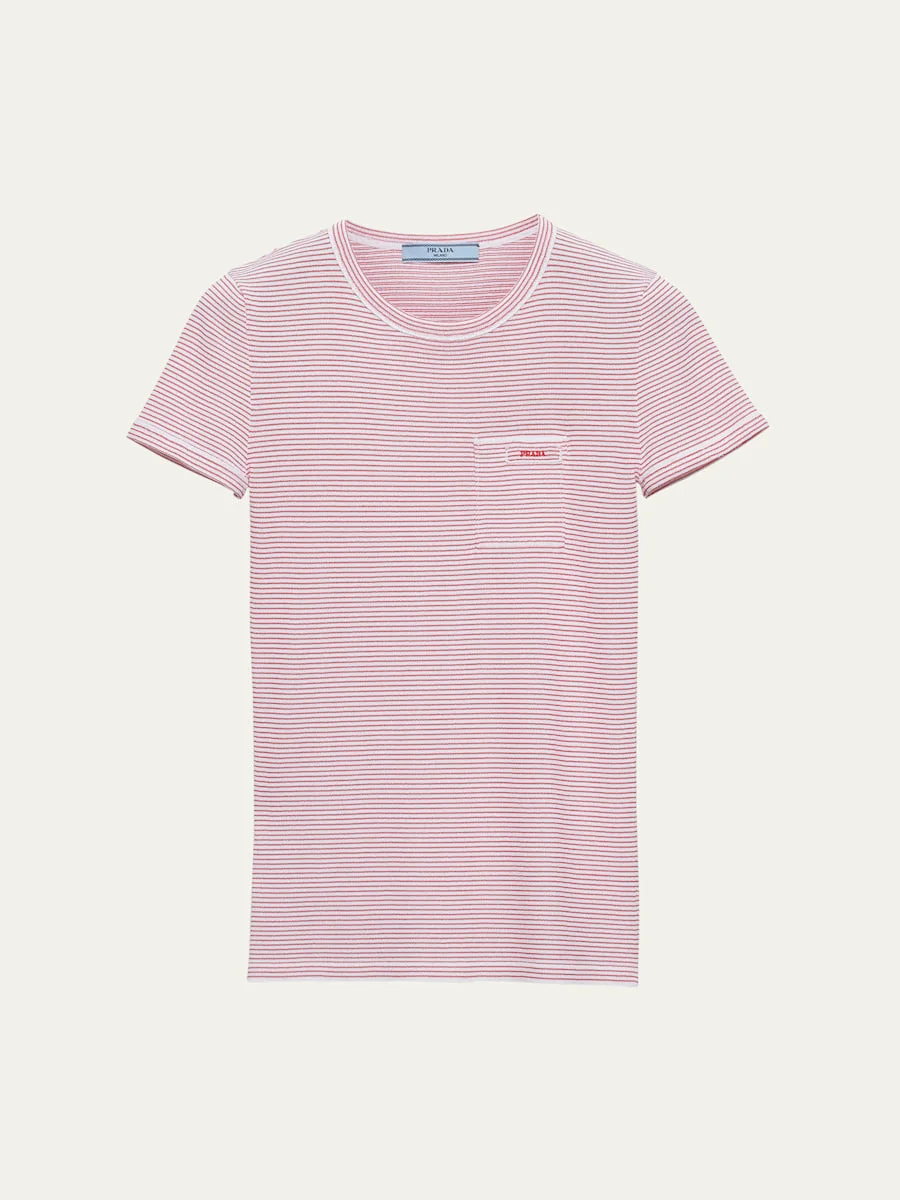 Prada "Riga" sweater with striped intarsia a logo pocket detail Crew neckline Short sleeves Chest patch pocket Fitted Pullover style Viscose/cotton Dry clean, professional cleaning recommended Made in Italy Online Inquiries: BGS21_BA56Z| Store Inquiries: #5039029