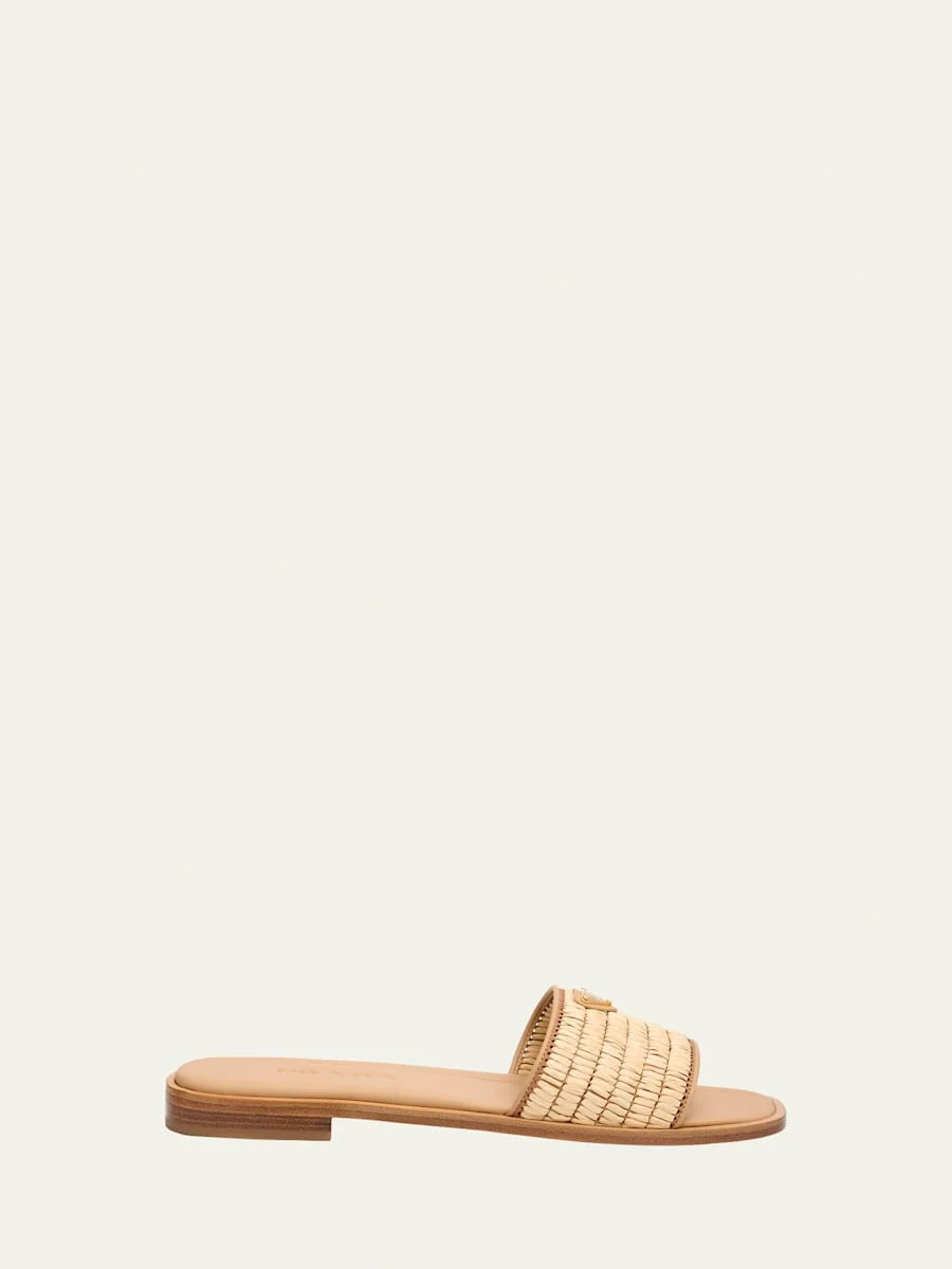 Prada "Stuoia" woven raffia easy sandals with leather piping and signature logo triangle 0.25 in / 10 mm flat heel Open toe Wide band upper Slide style Leather outsole Professional cleaning recommended, spot clean Made in Italy Online Inquiries: BGS21_X6SL1| Store Inquiries: #4939538