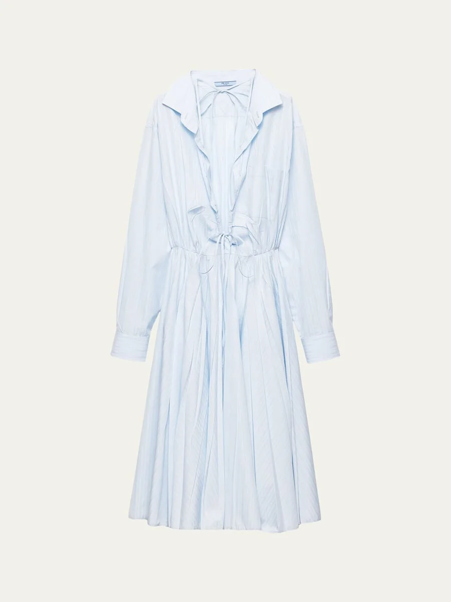 Prada cotton shirtdress finished with a tie front Signature logo patch on the back V neckline Long sleeves with button cuffs Chest pocket Relaxed, loose fit Hem falls below the knee Cotton Professional cleaning recommended Made in Italy