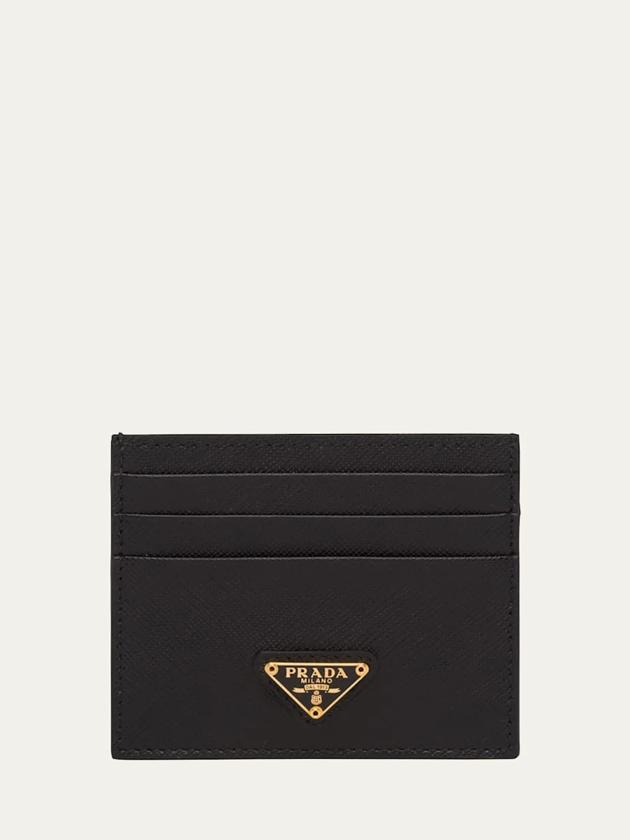 Prada card case in textured calf leather. Enameled metal triangle logo at front. Six card slots. Leather lining. Made in Italy. Online Inquiries: BGS21_D3XA4| Store Inquiries: #4036955