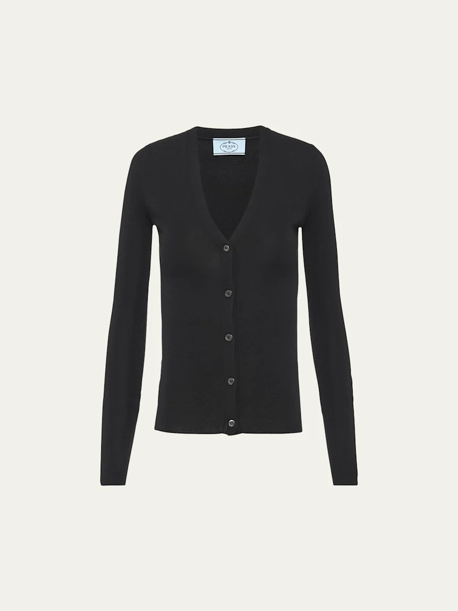 Prada cashmere-blend cardigan. V neckline; button front. Long sleeves. Slim fit. Cashmere/silk. Made in Italy. Model is 5'10"/177cm. Online Inquiries: BGS21_B97HV| Store Inquiries: #4036618