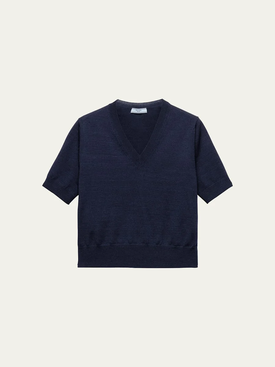 Prada knit sweater in a relaxed, boxy fit V neckline Short sleeves Semiraglan shoulder Pullover style Virgin wool Dry clean, professional cleaning recommended Made in Italy