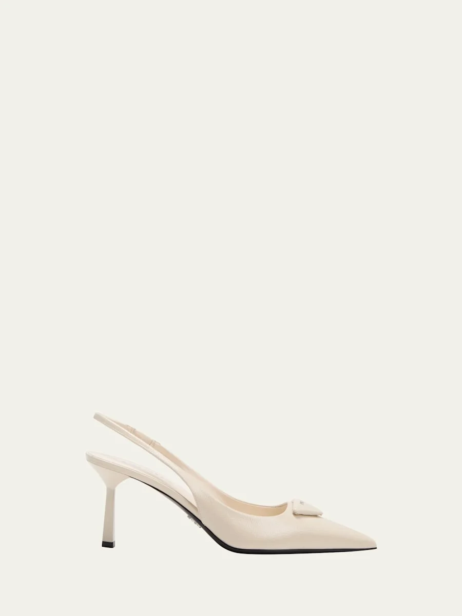 Prada smooth leather pumps with signature logo triangle accent 3.00 in / 75 mm stiletto heel Pointed toe Stretch slingback strap Leather outsole Professional cleaning recommended, spot clean Made in Italy Size Note: Runs true to size. Online Inquiries: BGS21_X6L6W| Store Inquiries: #4794515