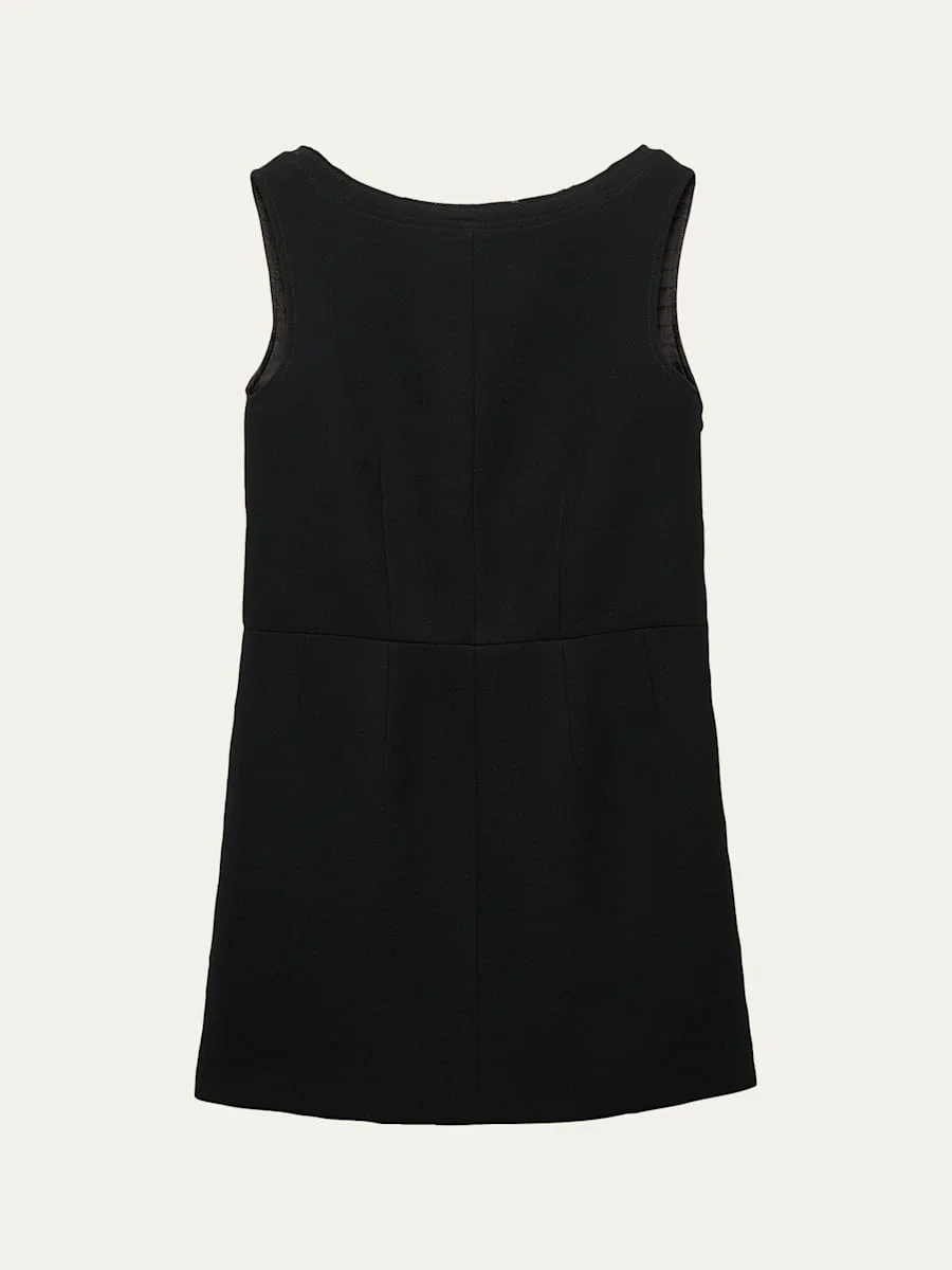 Crafted from solid wool, this Prada mini dress is adorned with a delicate bow at the back for a tailored yet feminine silhouette. Boat neckline Sleeveless Straight silhouette Hem falls above the knee Side zip Virgin wool Dry clean Made in Italy