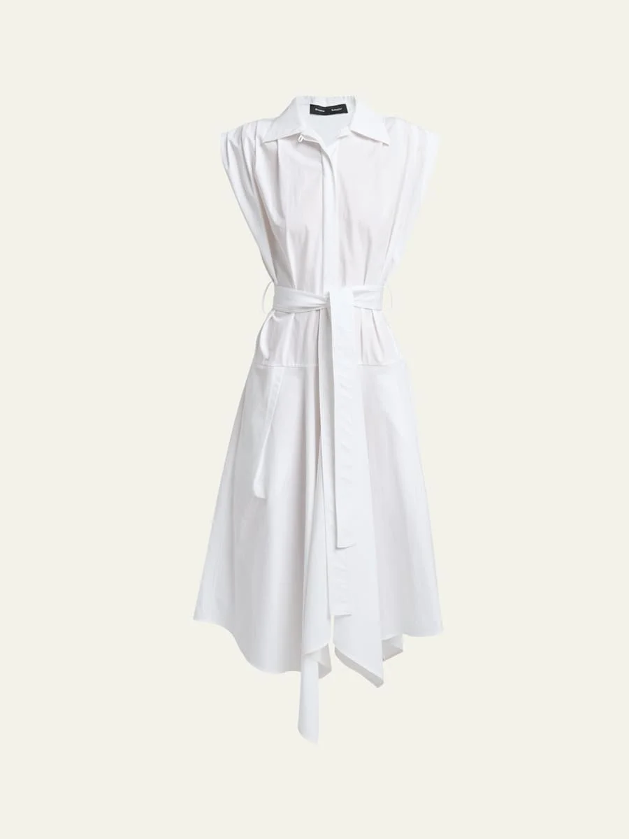 Crafted from crisp cotton poplin, the "Adinna" shirtdress from Proenza Schouler features pleated shoulders, a drop waist seam, and a handkerchief hem Spread collar; concealed button front Cap sleeves Belted waist Side split pockets Aline silhouette Hem falls below the knee Handkerchief hem Cotton Dry clean Made in Portugal