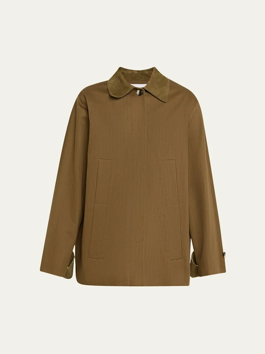 Proenza Schouler White Label "Angela" cotton jacket in fine herringbone Contrast point collar Long raglan sleeves with belted cuffs Double slip pockets Relaxed fit Hem falls to the hip Snap-front Cotton Dry clean Imported Online Inquiries: BGS21_T6NV4| Store Inquiries: #5021983
