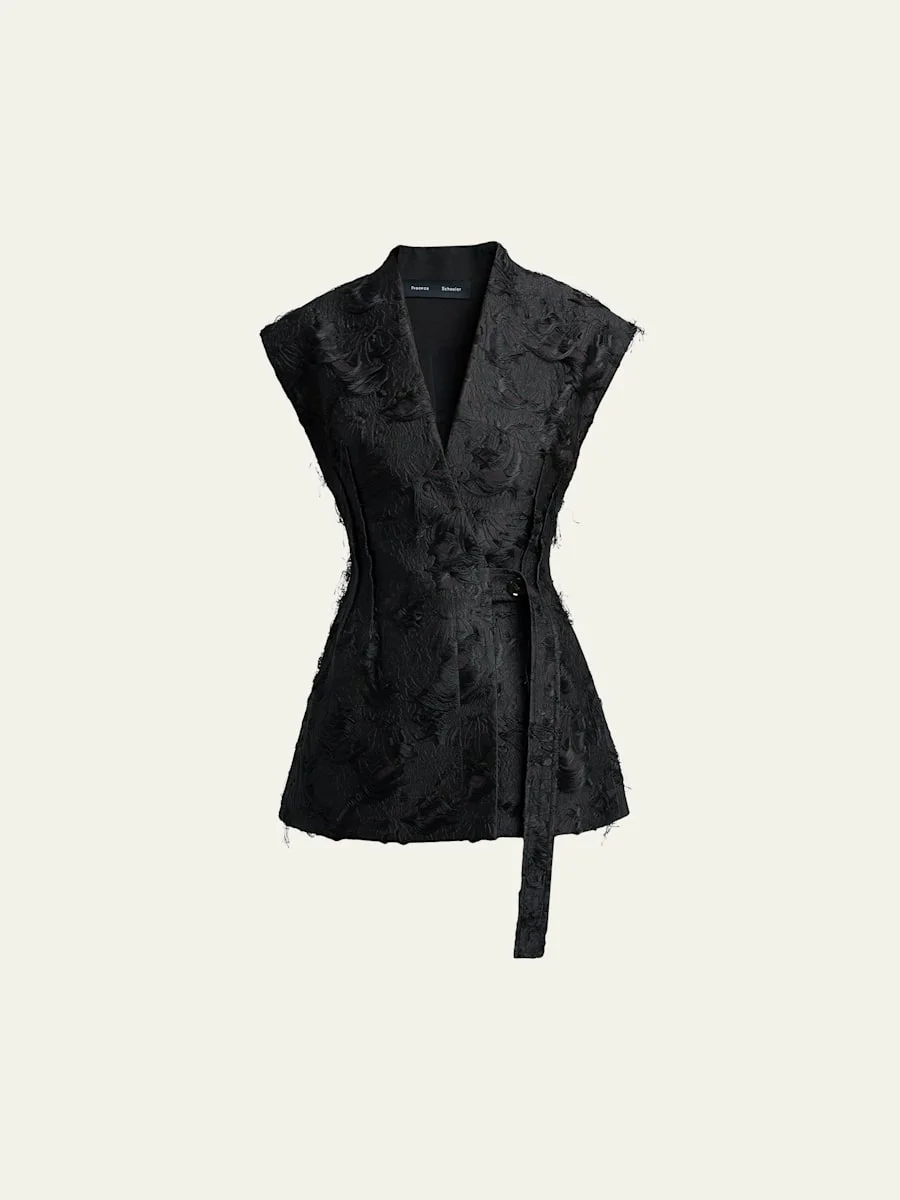 Designed with a refined silhouette, the "Cindle" vest by Proenza Schouler is crafted from chrysanthemum jacquard and showcases an adjustable belt to cinch the silhouette. V neckline Sleeveless Tailored fit Hem sits at the hip Button closure Viscose/silk/polyester Lining: Viscose/polyester Dry clean Made in Italy