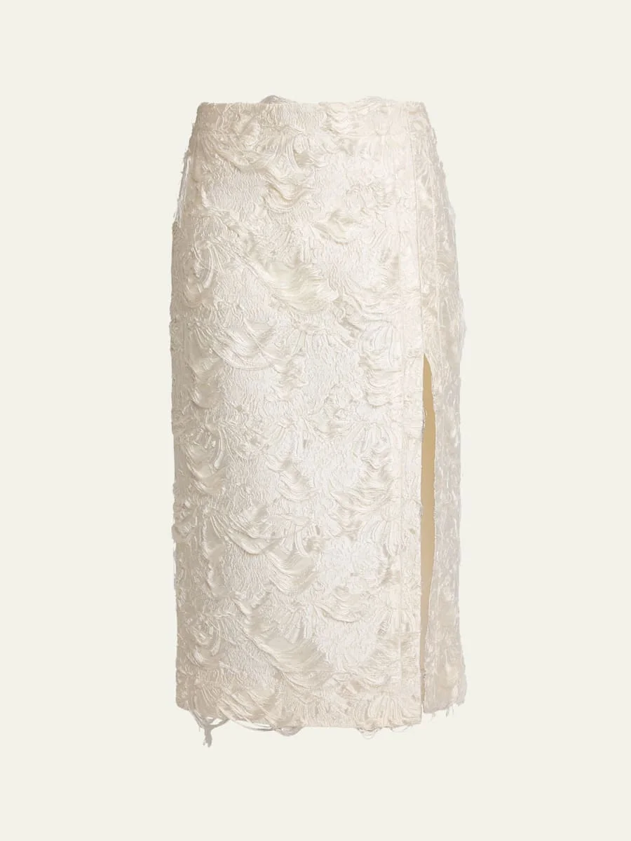 Designed in chrysanthemum float jacquard, the "Dalma" skirt by Proenza Schouler exudes elegance with a side slit and delicate thread details throughout. High rise Pencil style Hem falls below the knee Invisible side zip closure Viscose/silk/polyester Lining: Viscose/polyester Dry clean Made in Italy