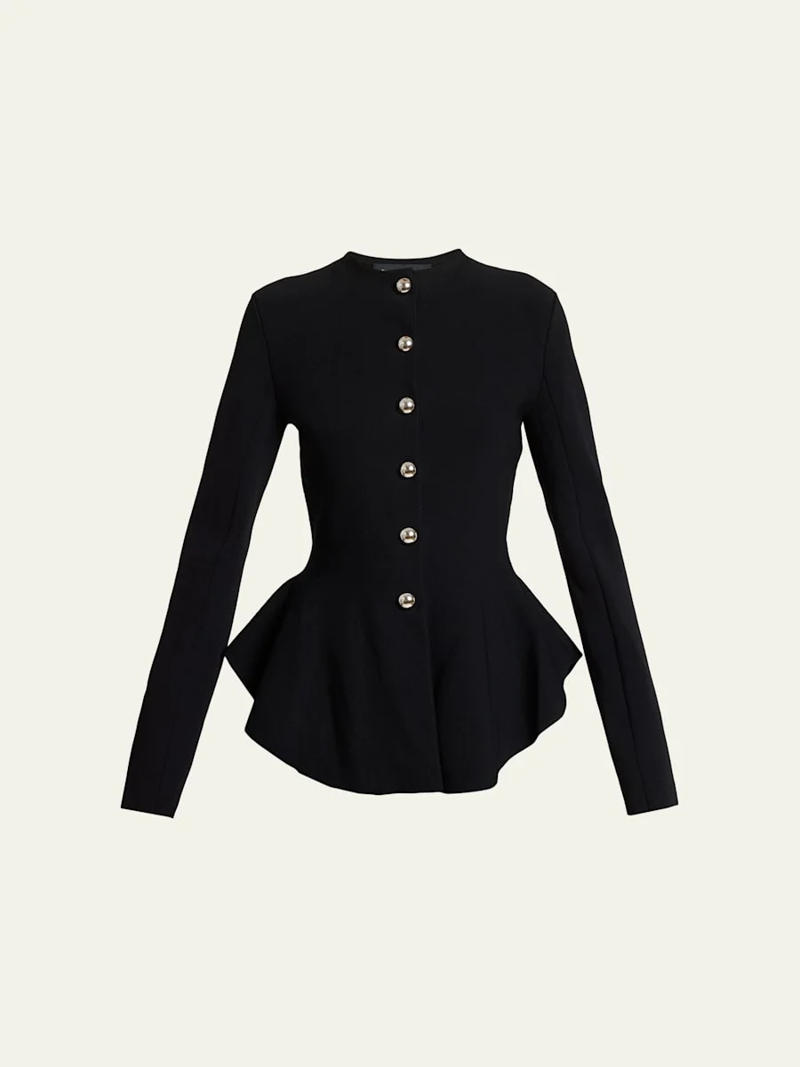 Finished with a voluminous peplum hem, the "Dasha" jacket by Proenza Schouler is crafted from compact viscose and adorned with silver dome buttons for a touch of shine. High neckline Long sleeves Fitted silhouette Buttonfront Viscose/nylon/polyamide Dry clean Imported