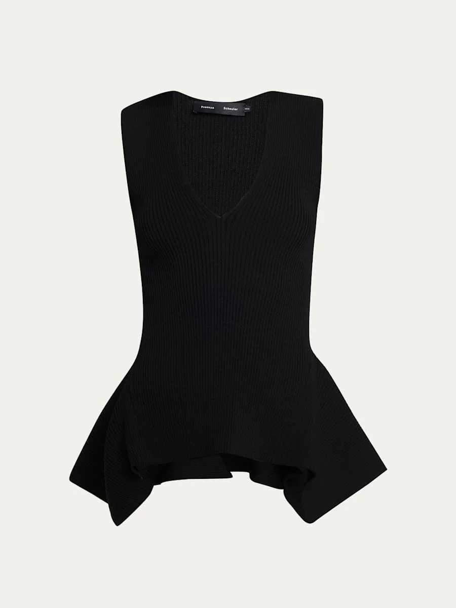 Proenza Schouler White Label "Eugenie" top crafted from a sculpting ribbed knit V neckline Sleeveless Slim fit Peplum hem Pullover style Acetate/viscose Dry clean Imported SIZE amp; FITModel measurements: 5'10" tall Model is wearing a US size 4/Small