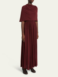Proenza Schouler "Frankie" matte jersey dress with a cape and pleated skirt Funnel neckline Short sleeves Full length Aline silhouette Button closure Viscose Dry clean Made in Italy