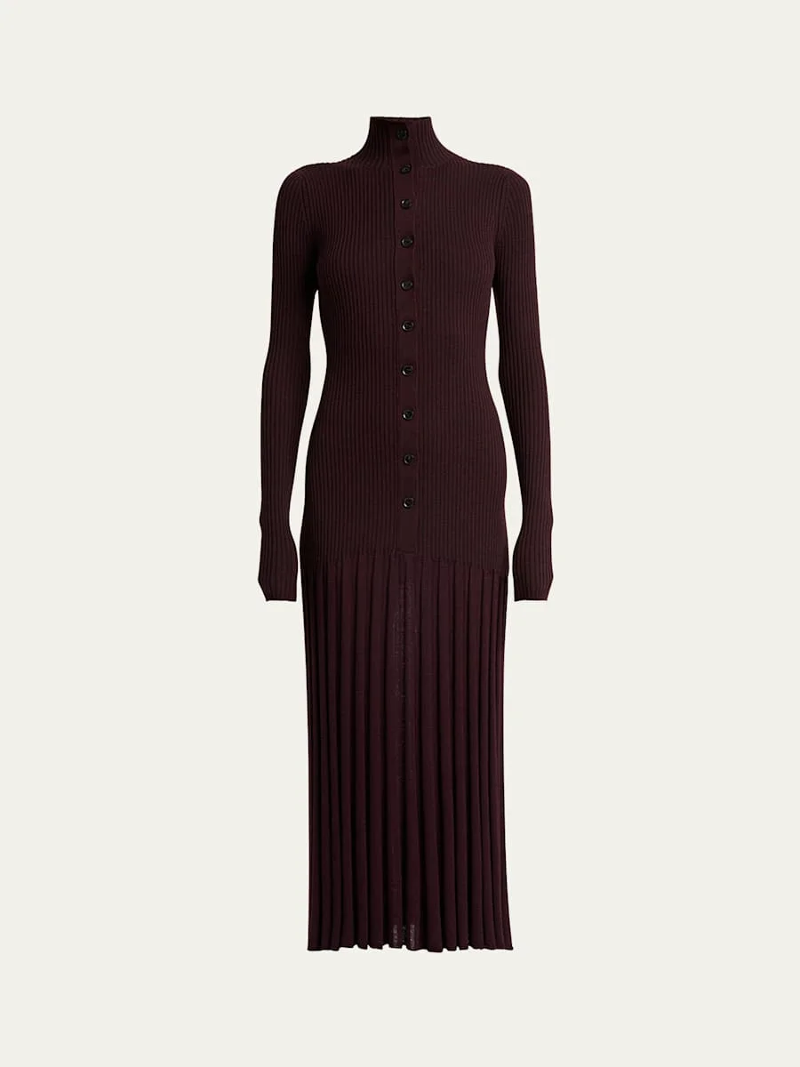 Jada Turtleneck Mutli-Rib Button-Front Maxi Dress