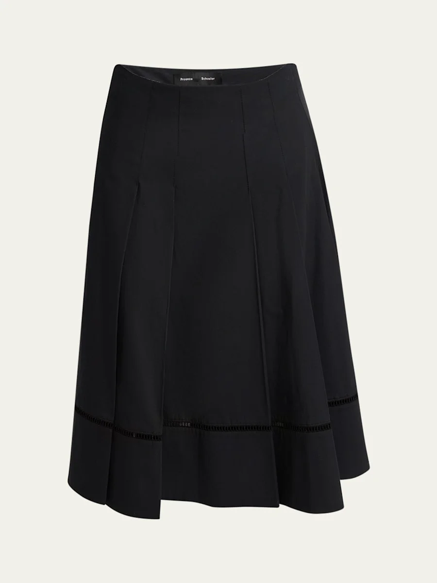 Proenza Schouler "Laci" eco-cotton poplin skirt finished with pleating and lattice trim High waist Hem falls below the knee A-line silhouette Invisible side zip Cotton/elastane/polyester Dry clean Made in Portugal Online Inquiries: BGS21_BA4BE| Store Inquiries: #5031098