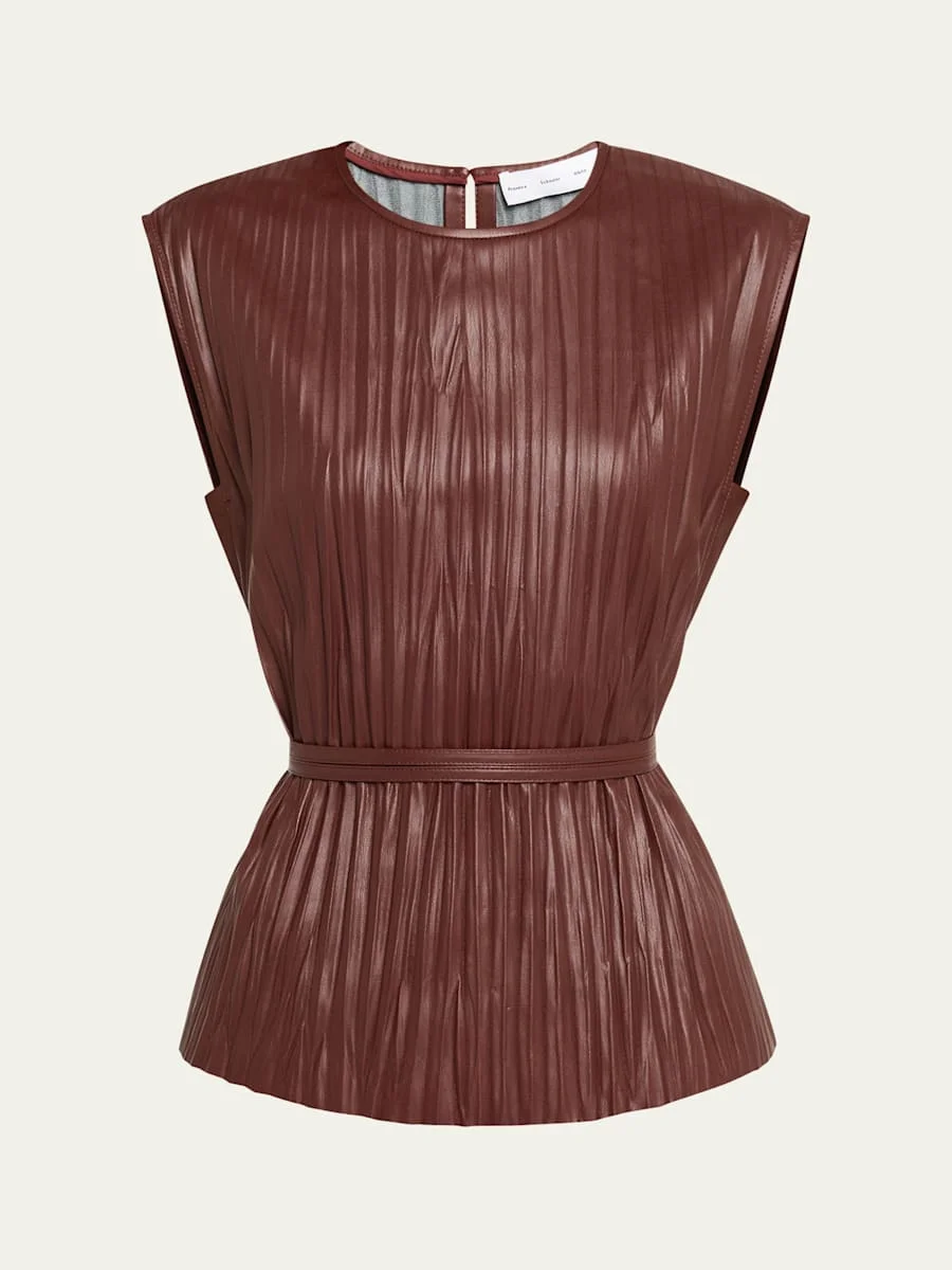 Crafted from vegan leather, the "Lyra" top by Proenza Schouler is finished with pleats for a modern look. Crew neckline Sleeveless Defined waist Classic fit Hem falls to the hip Center back zip Polyurethane Dry clean Imported Online Inquiries: BGS21_T885D| Store Inquiries: #5251671