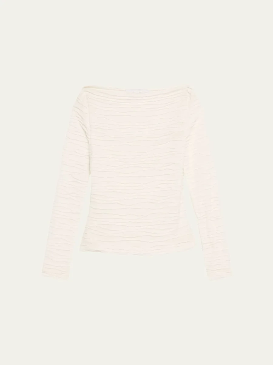 Proenza Schouler White Label "Paloma" textured cotton-blend top High neckline Long sleeves Fitted Hem sits at the hip Pullover style Polyester/rayon/cellulose acetate Dry clean Imported Online Inquiries: BGS21_T6NV5| Store Inquiries: #5021984