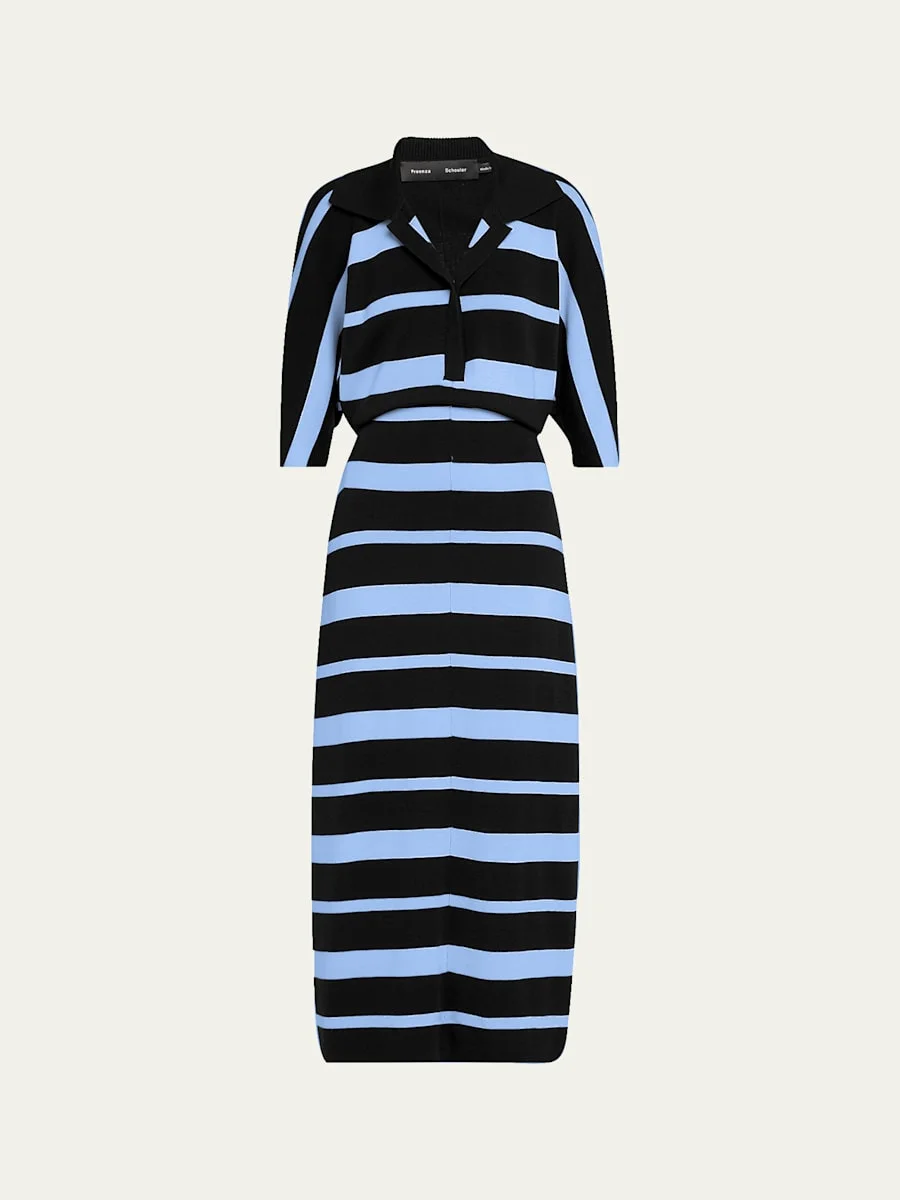 Proenza Schouler "Solana" polo dress crafted from superfine knit with a stripe pattern Spread collar; button placket Elbow-length sleeve Hem falls below the knee Sheath silhouette Center back slit Slipover style Wool/silk Unlined Made in Italy Online Inquiries: BGS21_BA4HE| Store Inquiries: #5033392
