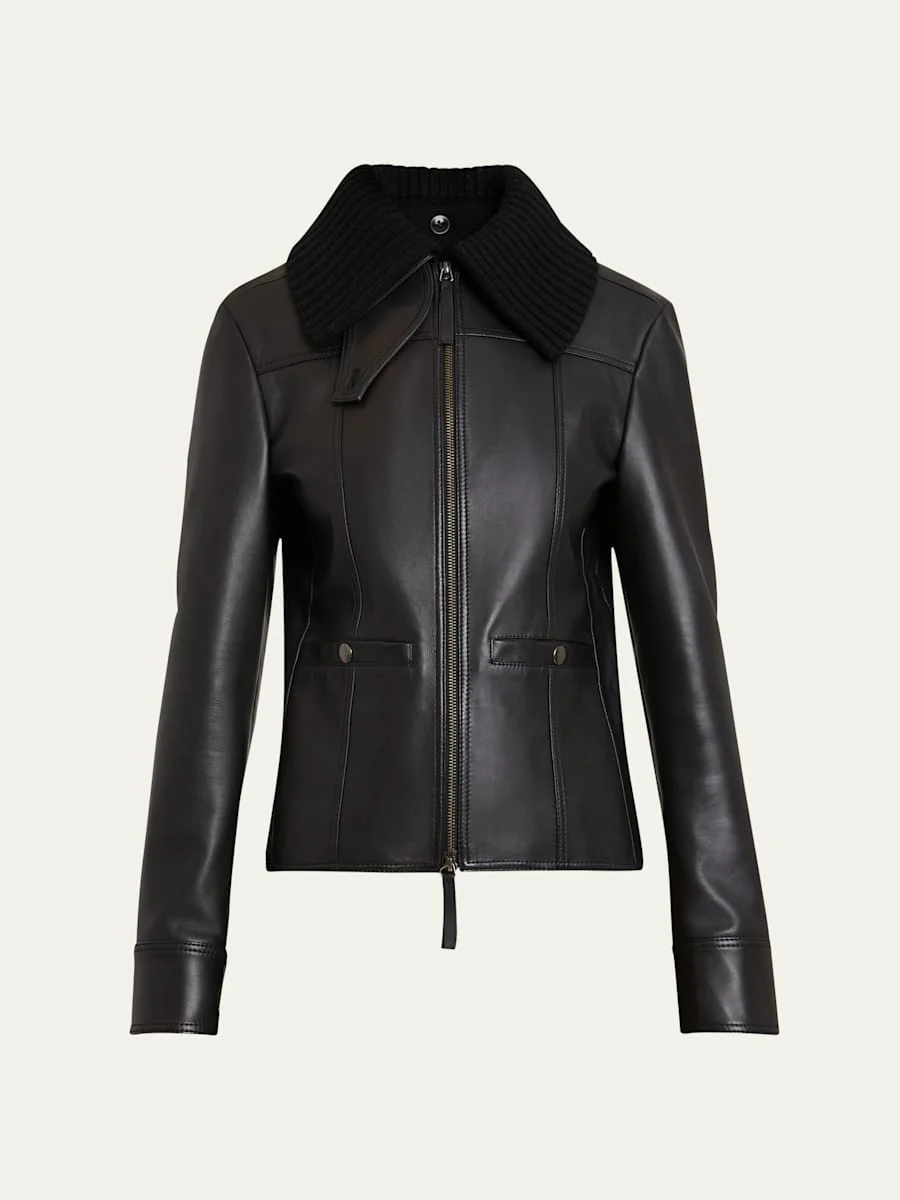 Proenza Schouler White Label "Vaughn" paneled leather jacket featuring a detachable knit collar Throat latch Long sleeves with snap-over zip cuffs Snap pockets Tailored fit Hem sits at the hip Two-way zip front Leather Dry clean Made in Italy Model is 5'10"/177cm. Online Inquiries: BGS21_T5ZMM| Store Inquiries: #4868366