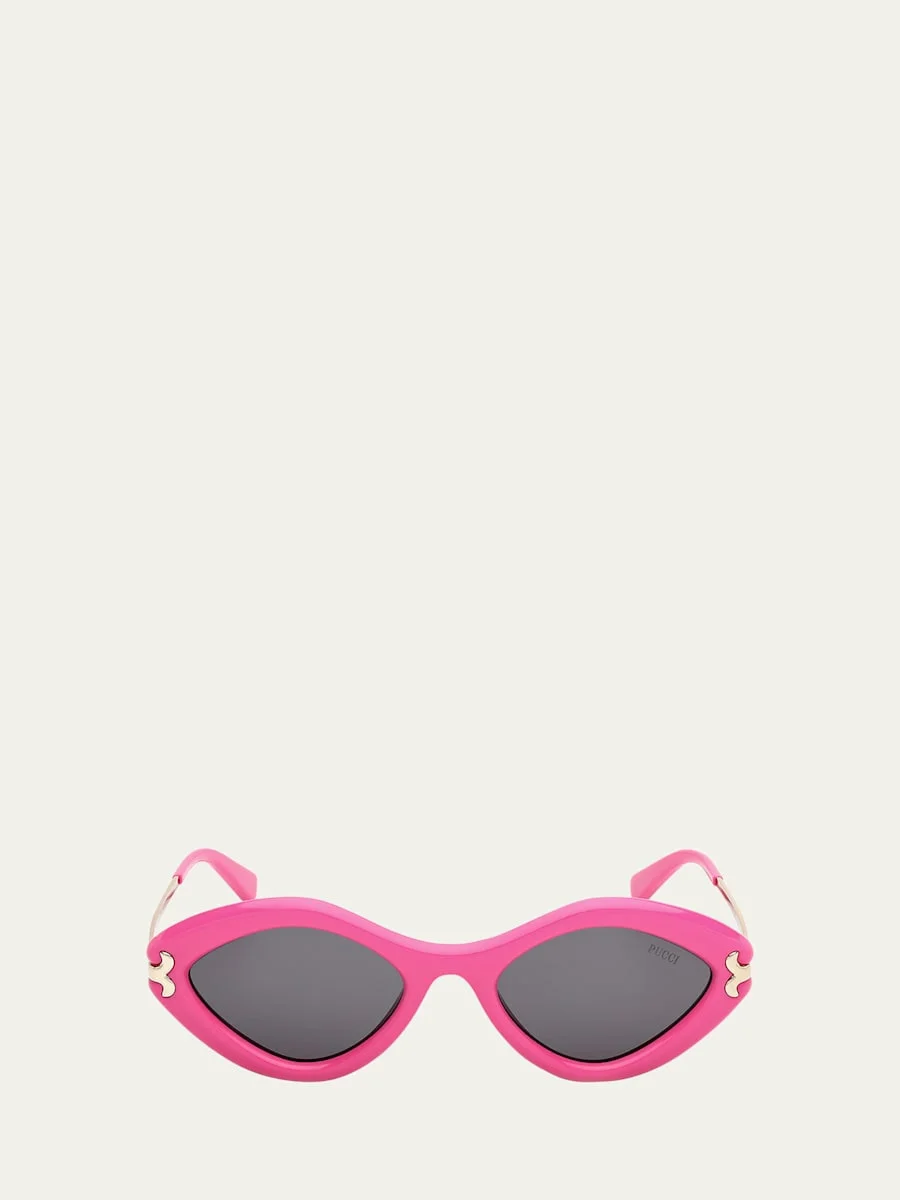 Emilio Pucci "EP0223W" oval sunglasses in acetate and metal Lens/bridge/temple (in mm): 54-21-140 Solid lenses; logo on the corner Saddle nose bridge Logo on temples Thin, tapered arms Capped earpieces 100% UVA/UVB protection Imported Proposition 65 warning for California residents Online Inquiries: BGS21_D4W47| Store Inquiries: #4747971