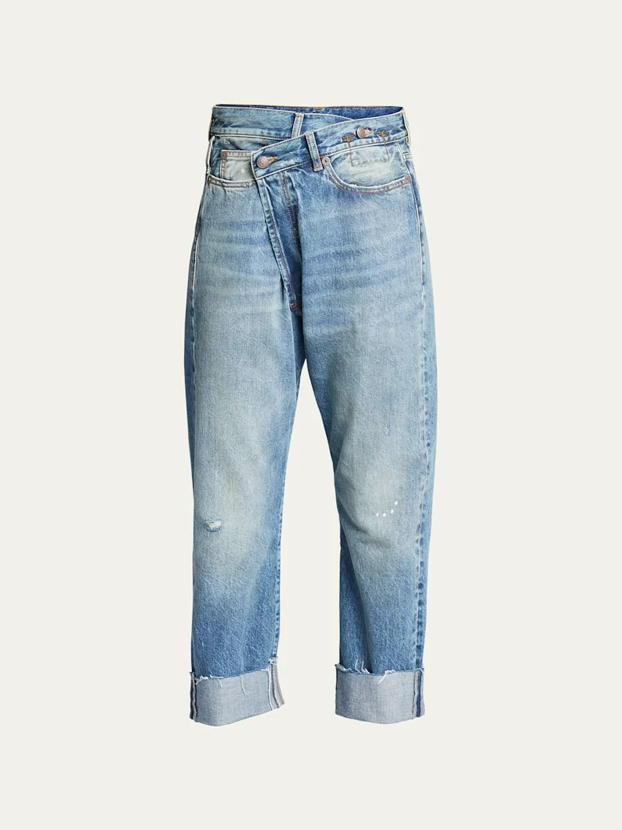 R13 jeans in distressed denim. Mid rise. Crossover front. Five-pocket style. Relaxed straight fit. Cuffed hem. Ankle length. Button/zip fly; belt loops. Cotton. Made in Italy. Online Inquiries: BGS21_T0T3V| Store Inquiries: #3523324