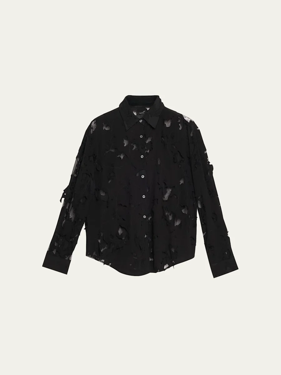 R13 destroyed shirt with mesh inlay throughout Point collar Long sleeves Slim fit Rounded hem Button-front Viscose/nylon/polyamide Machine wash cold Made in USA Online Inquiries: BGS21_T6U2B| Store Inquiries: #5035334
