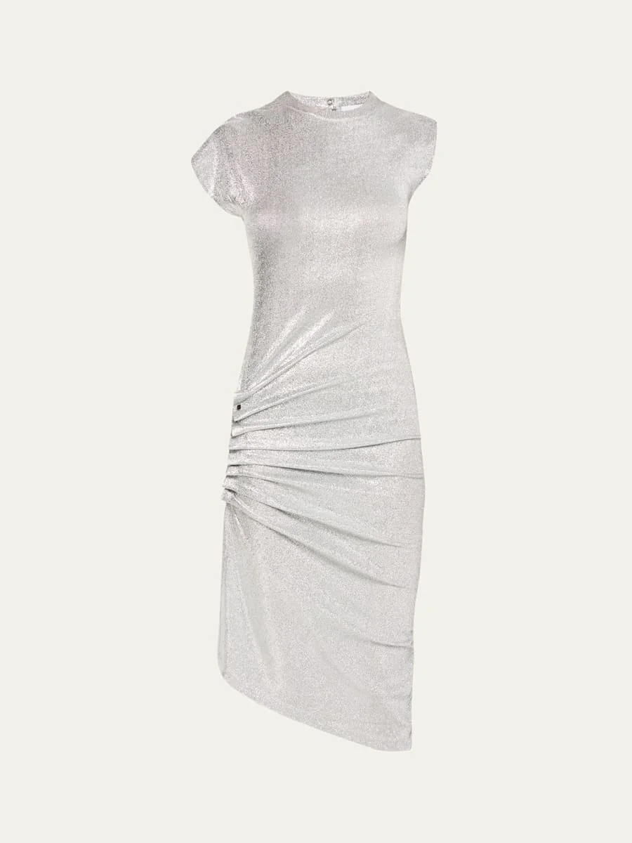 Rabanne draped Lurex jersey dress pleated on the side by silver snap closures Round neckline Short sleeves Midi length Sheath silhouette Asymmetric hem Buttoned back Viscose Made in Portugal Online Inquiries: BGS21_B9LW0| Store Inquiries: #4908133