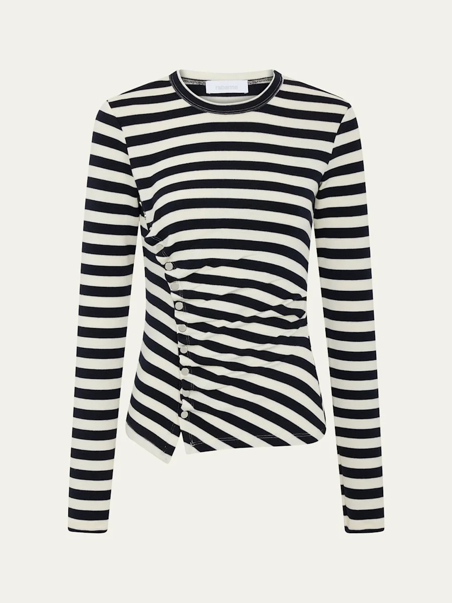 Rabanne striped top featuring asymmetric snap-button ruching Crew neckline Long sleeves Fitted Pullover style Wool/elastane Made in Portugal Online Inquiries: BGS21_BA5R3| Store Inquiries: #5041197