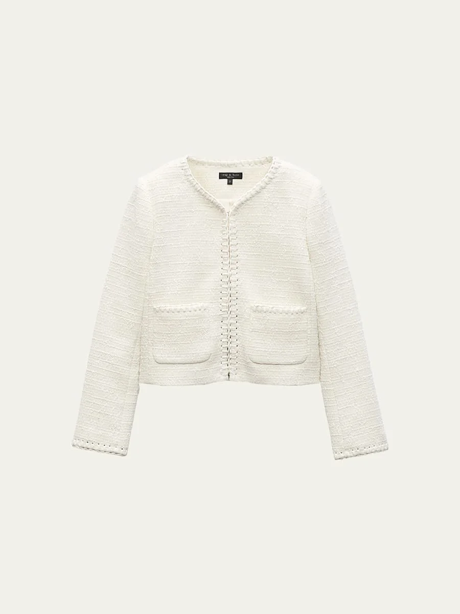 Rag & Bone "Cheyenne" tweed jacket featuring tonal blanket stitching Round neckline Bracelet sleeves Patch pockets Tailored fit Cropped length Front hook closure Viscose/polyester Dry clean Imported Online Inquiries: BGS21_T6GCJ| Store Inquiries: #4979728