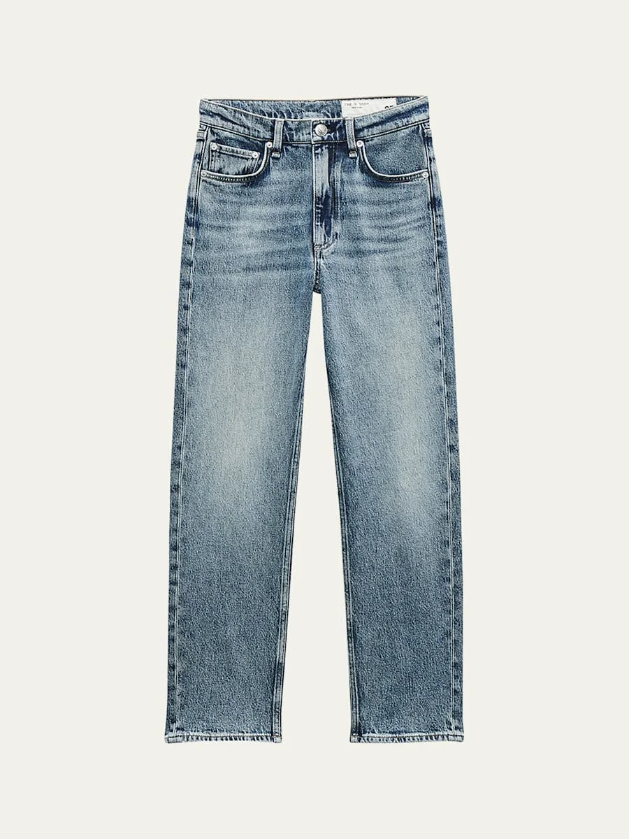 Rag amp; Bone "Harlow" jeans in mediumwash stretch denim Approx. 11" rise; 28.5" inseam Midrise; sits high on the hip Fivepocket style Straight legs Ankle length Button/zip fly; belt loops Cotton/elastane Machine wash cold Imported
