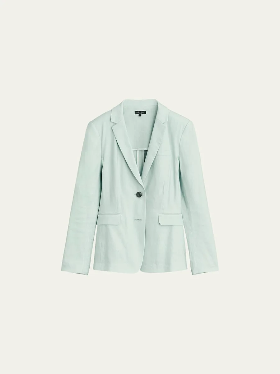 Rag & Bone "Razor" classic linen blazer Notched lapels Single-breasted front Long sleeves; button cuffs Flap and welt pockets Vented back Tailored fit Two-button closure Linen Dry clean Imported Model is 5'10"/177cm. Online Inquiries: BGS21_T4M87| Store Inquiries: #4522321